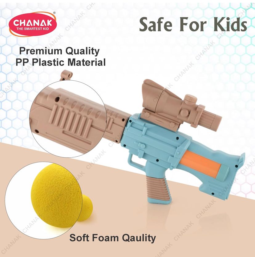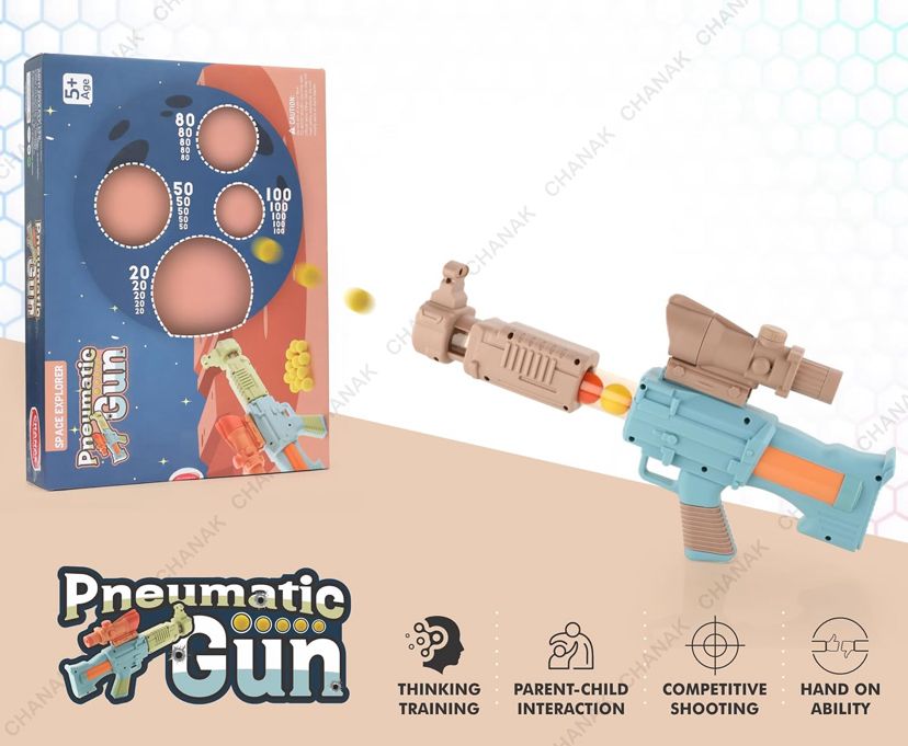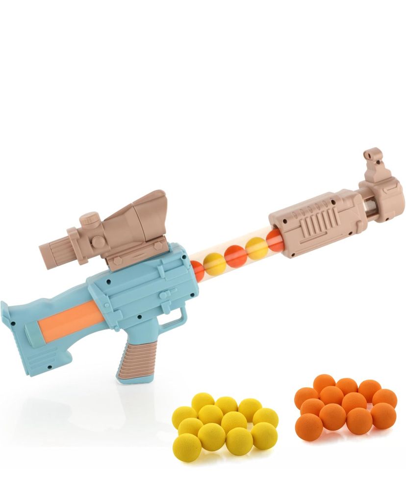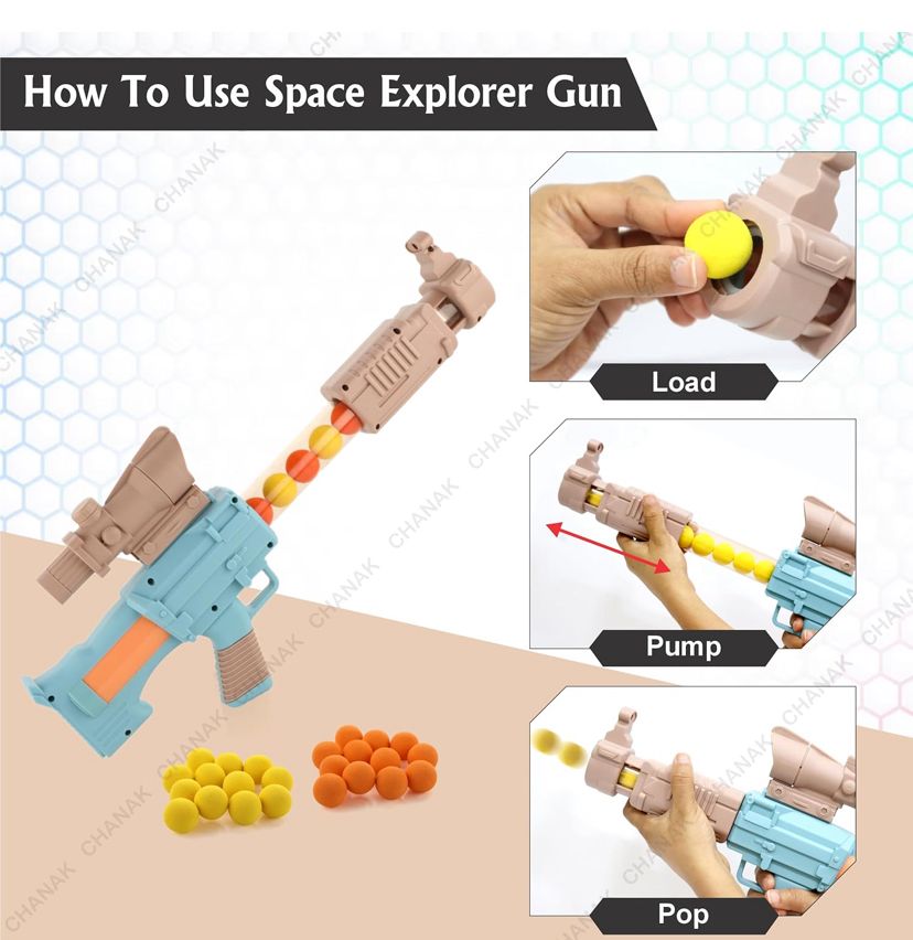 Space explorer gun toy with 12 orange and 12 yellow soft foam ball for indoor play, safe to play